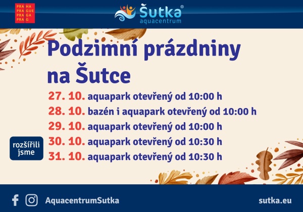 Vážení návštěvníci, rádi bychom Vás upozornili, že o podzimních prázdninách Prahy 8 v termínu 27. a 29. 10. 2024 máme aquapark otevřen již od 10:00 hodin! Ve svátek 28. 10. je bazén i aquapark otevřen od 10 hodin.