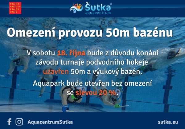 Vážení návštěvníci, v sobotu 18. října 2025 bude 50m bazén a výukový bazén po celý den uzavřen z důvodu konání závodů podvodního hokeje.
