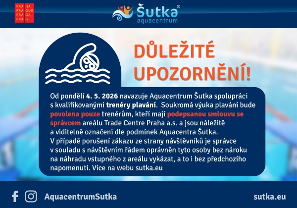 Z důvodu konání závodu Plavecko-běžeckého poháru, který se koná pod záštitou HMP a MČ Praha 8, bude ve čtvrtek 26. 3. 2026 celý areál od 8:00 do 11:00 uzavřen.