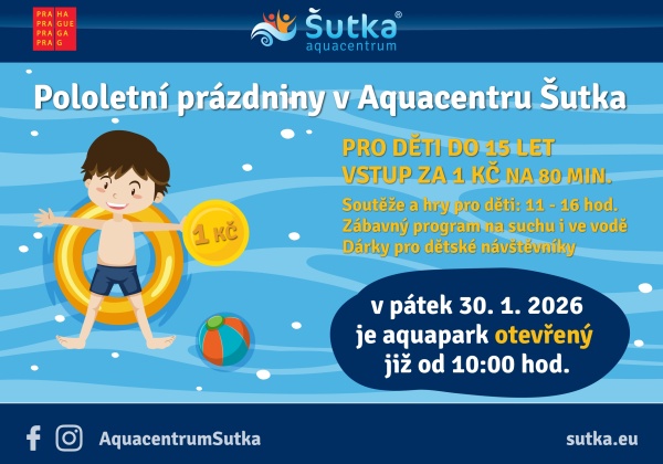 Školáci, přijďte se odměnit za půlroční školní snažení do Aquacentra Šutka! Ať už máte vysvědčení jakékoliv, v pátek 30. ledna 2026 vás odměníme. Všechny děti do 15 let budou mít vstup na 80 minut pouze za jednu korunu. Aquapark otevíráme už v 10...