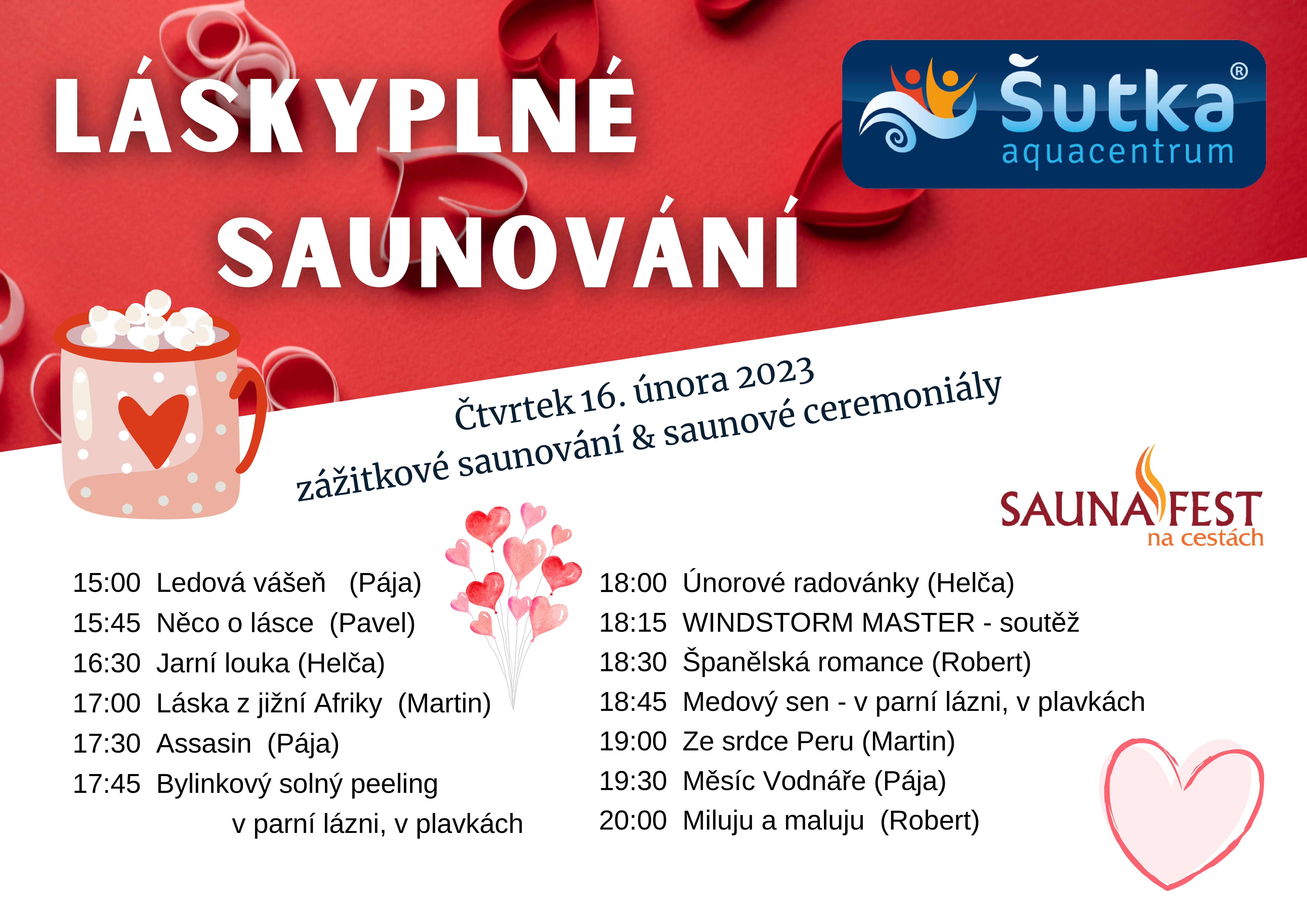 Saunové ceremoniály v Aquacentru Šutka spojují blahodárné účinky saunování, relaxaci a odpočinek společně s výjimečným zážitkem a nevšední show. Zážitkovému saunování bude v Aquacentru Šutka vyčleněna vždy jedna sauna a jedna pára. Ostatní je funkční dle běžného provozu. Veškerý program saunových ceremoniálů je zahrnut do běžné ceny vstupného. Romantické saunování bude probíhat v čase od 15:00 do 20:30.