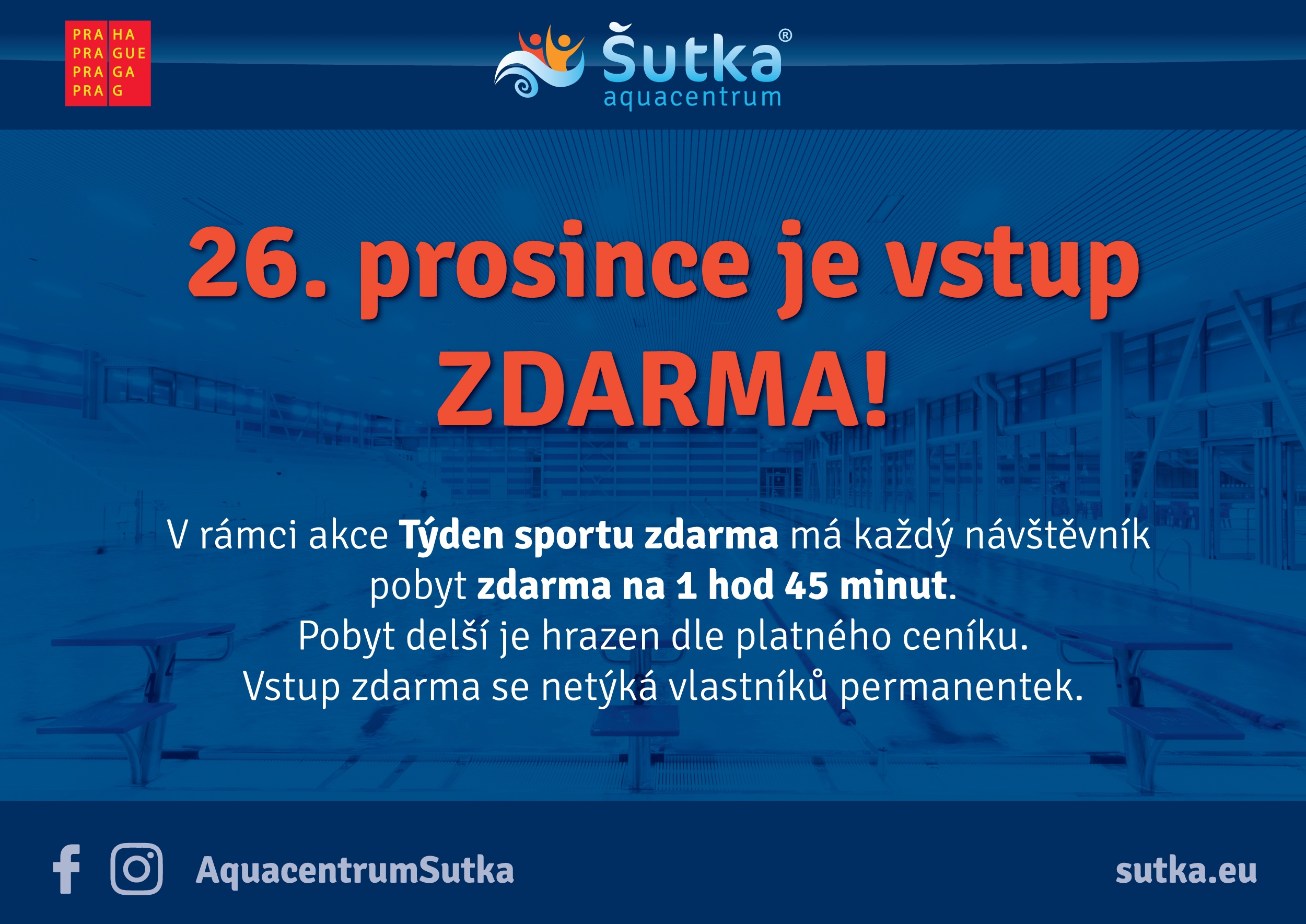 Areál Aquacentra Šutka se i letos opět zapojil do projektu hlavního města Prahy TÝDEN SPORTU ZDARMA a nabízí tak svým návštěvníkům v úterý 26. 12. 2023 první hodinu a 45 minut vstupu ZDARMA. Přijďte si k nám užít spoustu zábavy.