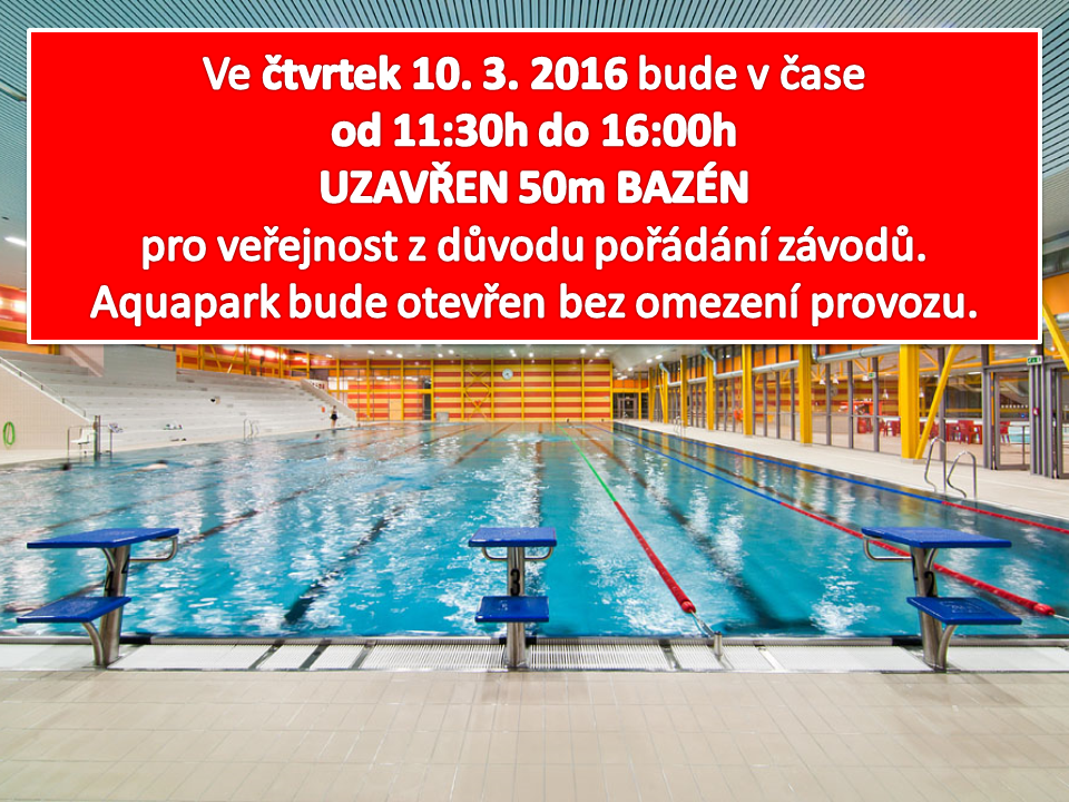 Vážení návštěvníci, ve čtvrtek dne 10. 3. 2016 bude v termínu od 11:30 hod do 16:00 hod uzavřen 50m bazén pro veřejnost z důvodu pořádání závodů. Aquapark bude otevřen bez omezení provozu. Děkujeme za pochopení.