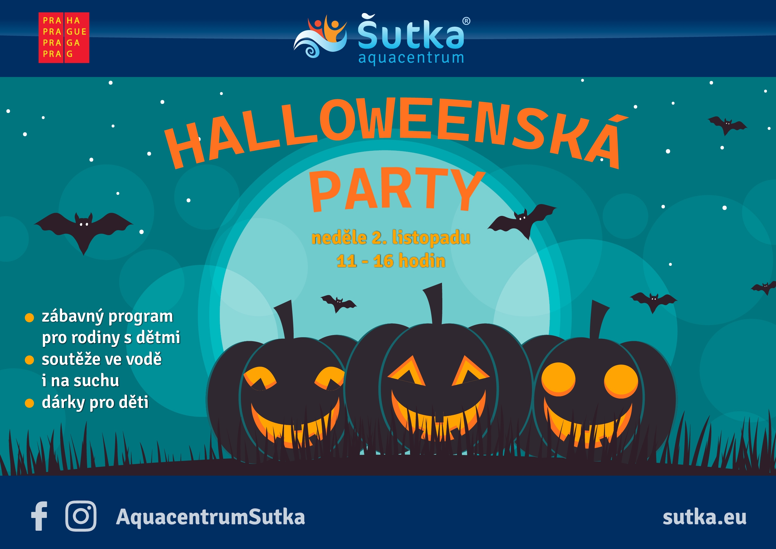 Jak je oslavit? Co trochu netradičně? V neděli 2. listopadu 2025 můžete s celou svou rodinou nebo přáteli vyrazit do Aquacentra Šutka a užít si báječnou Halloweenskou párty.